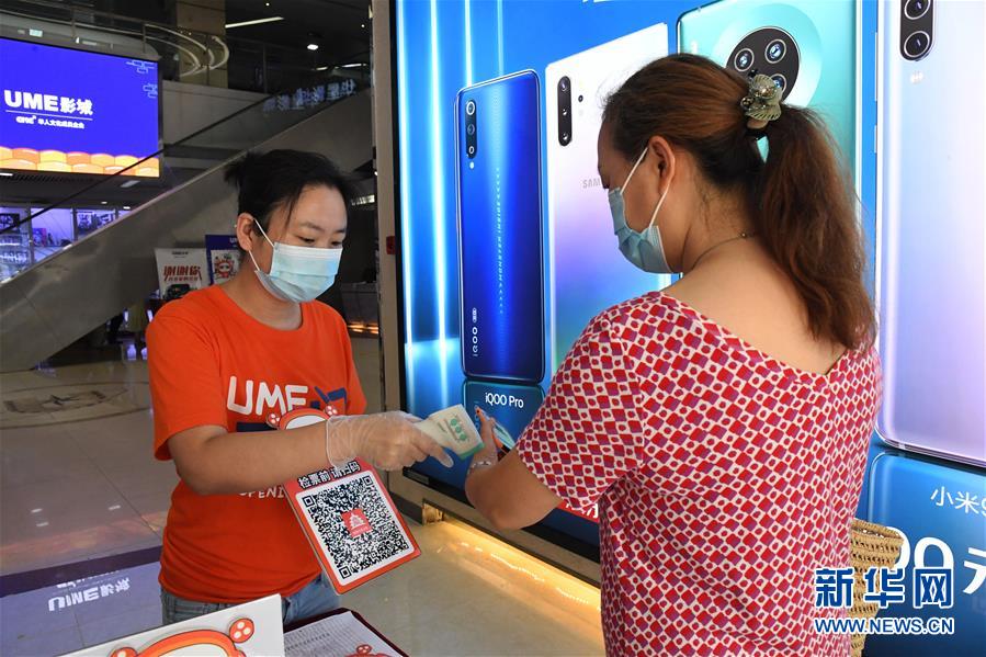 7月24日,在UME影城北京華星店,工作人員(左)為觀眾測量體溫。當日,在做好新冠肺炎疫情防控的前提下,北京市部分電影院有序恢復開放。新華社記者 任超 攝