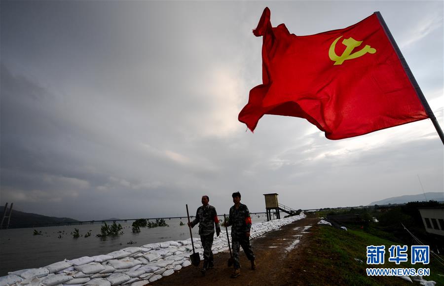 7月19日,傍晚時(shí)分,陳申桃(左)和兒子在圩堤上行走。新華社記者胡晨歡攝