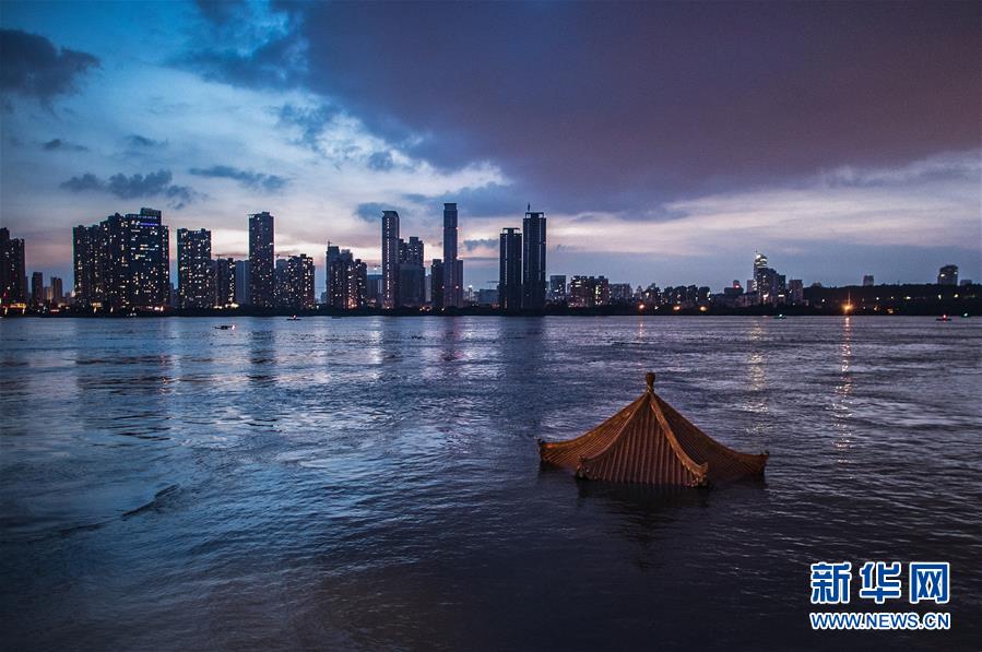 上漲的江水即將淹沒武昌黃花磯涼亭(7月13日攝)。新華社記者 肖藝九 攝