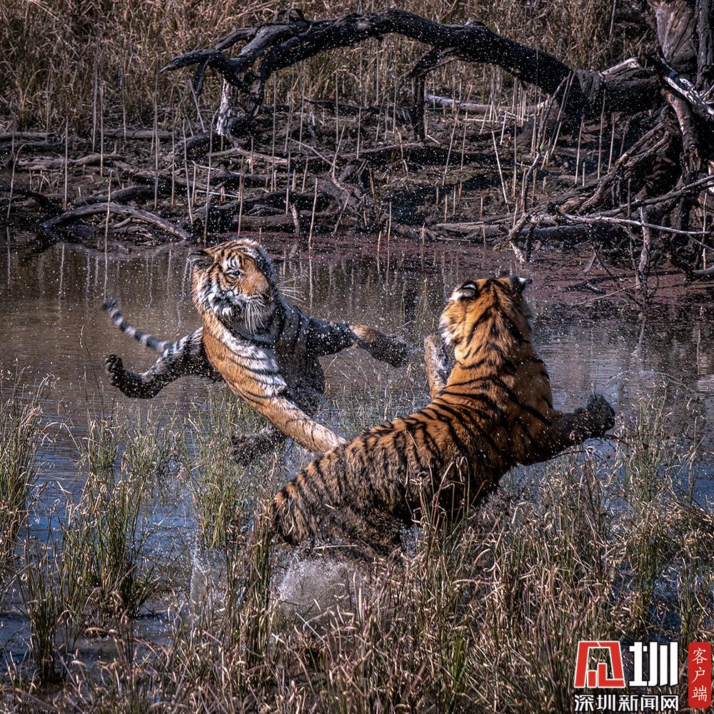 2020年7月27日,兩只老虎幼崽激烈的水上爭(zhēng)奪戰(zhàn)。