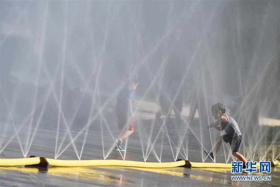 7月28日,在奧地利維也納,孩子在一處廣場戲水。新華社記者郭晨攝