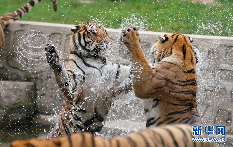 7月28日在橫道河子?xùn)|北虎林園拍攝的在水中納涼的東北虎。時(shí)值盛夏,位于黑龍江省海林市的橫道河子?xùn)|北虎林園的東北虎活動(dòng)量減少,以不同方式消夏納涼。新華社記者王建威攝