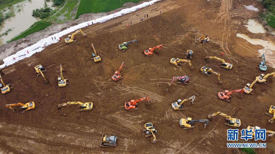 7月28日,在姜唐湖蓄洪區(qū)戴家湖一處涵閘險(xiǎn)情處置現(xiàn)場,人們操作機(jī)械設(shè)備在搶筑臨時(shí)圩堤(無人機(jī)照片)。新華社記者張端攝