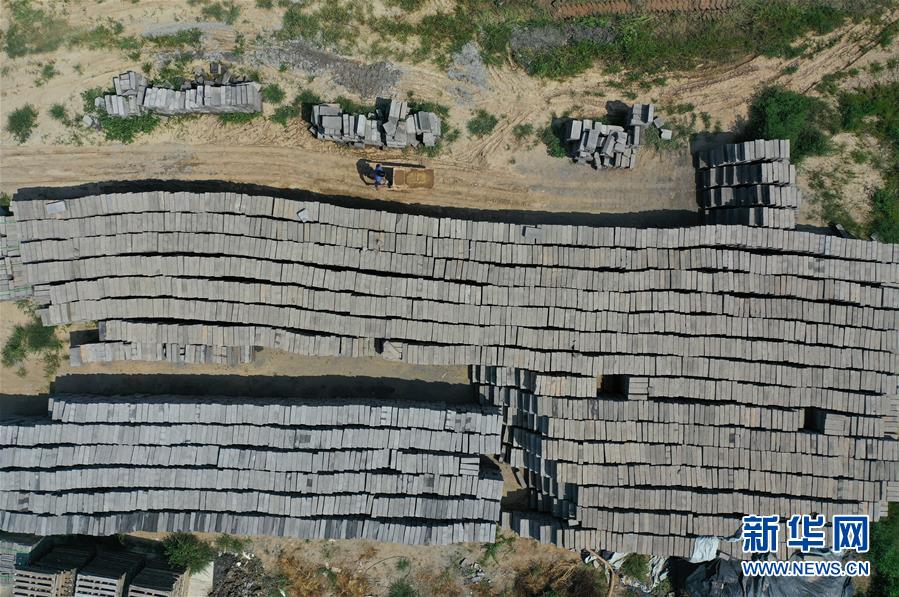 7月30日,河北省任丘市出岸鎮(zhèn)古建磚廠工人在搬運磚坯(無人機照片)。
