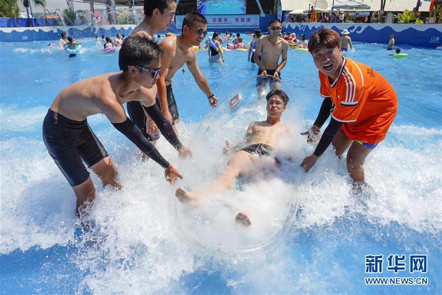 8月5日,重慶涪陵紅酒小鎮(zhèn)水上樂園內(nèi),一名游客躺在裝滿冰塊的冰船內(nèi)。當(dāng)日,重慶市氣象臺再次發(fā)布“高溫橙色預(yù)警信號”,重慶大部分海拔400米以下地區(qū)日最高氣溫將升至37℃以上,局地可達40℃以上。許多重慶市民涌進當(dāng)?shù)氐乃蠘穲@和泳池,在水中享受夏季的清涼。新華社記者劉潺攝