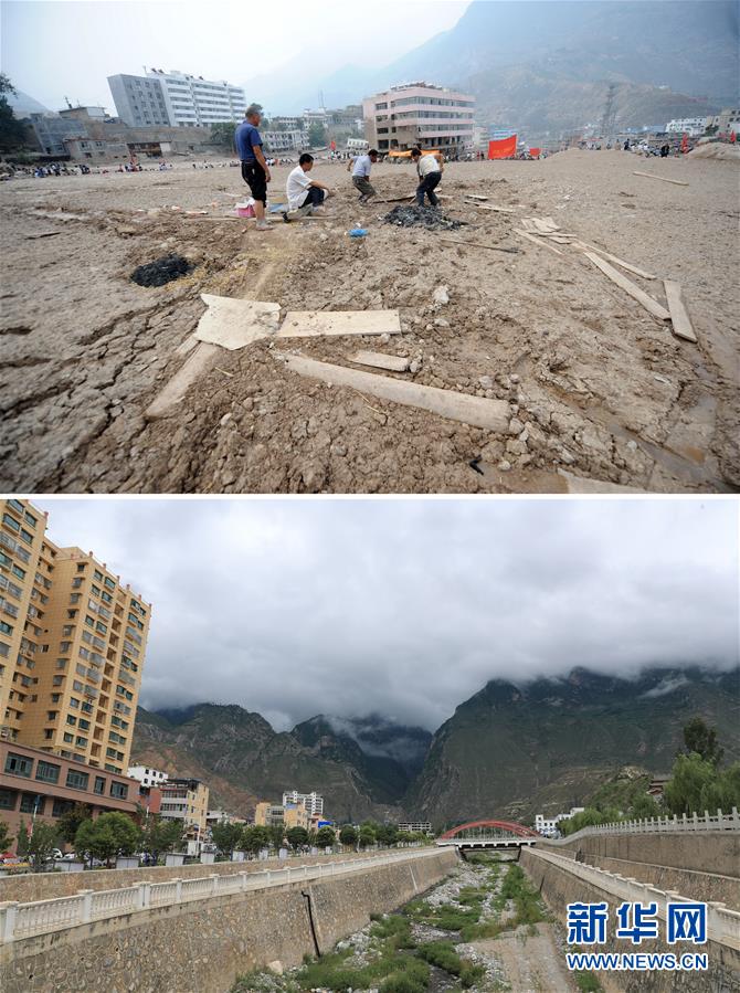 拼版照片:上圖為2010年8月11日,當?shù)厝罕娫谥矍h月圓村的泥石中搜救被埋人員(新華社記者聶建江攝);下圖為2020年7月14日拍攝的月圓村山洪泥石流排導渠(新華社記者杜哲宇攝)。新華社發(fā)