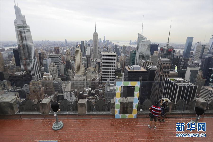 8月6日,在美國紐約,人們在洛克菲勒中心觀景臺上觀看城市景觀。當日,3月份暫時關(guān)閉的洛克菲勒中心觀景臺恢復對公眾開放。每天13時至21時,人們可戴口罩前往參觀。新華社記者王迎攝