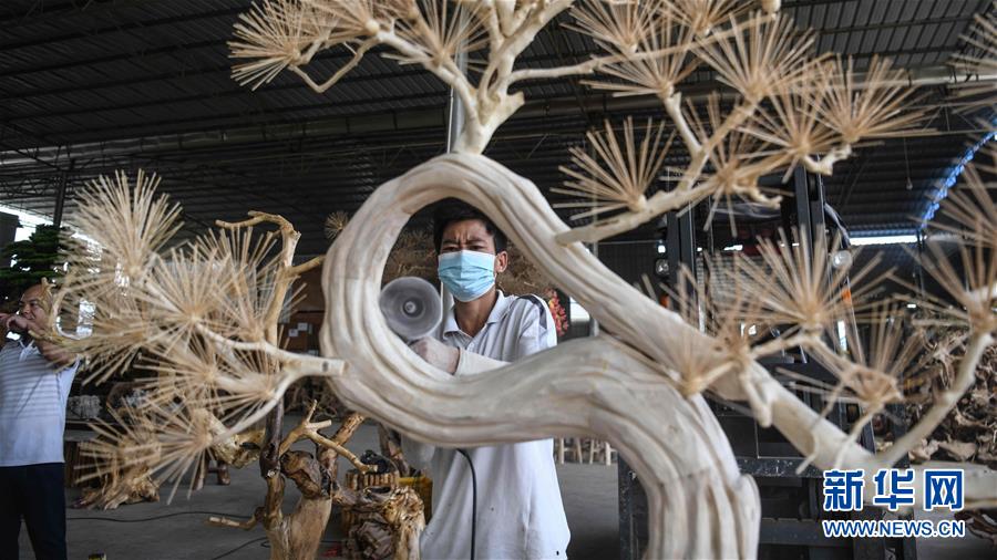 8月7日,工人在制作根雕工藝品。2017年以來,廣西桂林市永??h永安鄉(xiāng)通過幫扶返鄉(xiāng)青年創(chuàng)業(yè)的方式,建立起根雕工藝品就業(yè)扶貧車間,組織貧困群眾進(jìn)車間務(wù)工學(xué)藝,把當(dāng)?shù)刎S富的朽木和柑橘樹根枝資源利用起來,加工成盆景、茶桌、吊燈等根雕工藝品,不僅幫助貧困群眾在家門口掌握一技之長(zhǎng),還讓他們?cè)诿撠氄焙髮?shí)現(xiàn)穩(wěn)定增收。新華社記者張愛林?jǐn)z