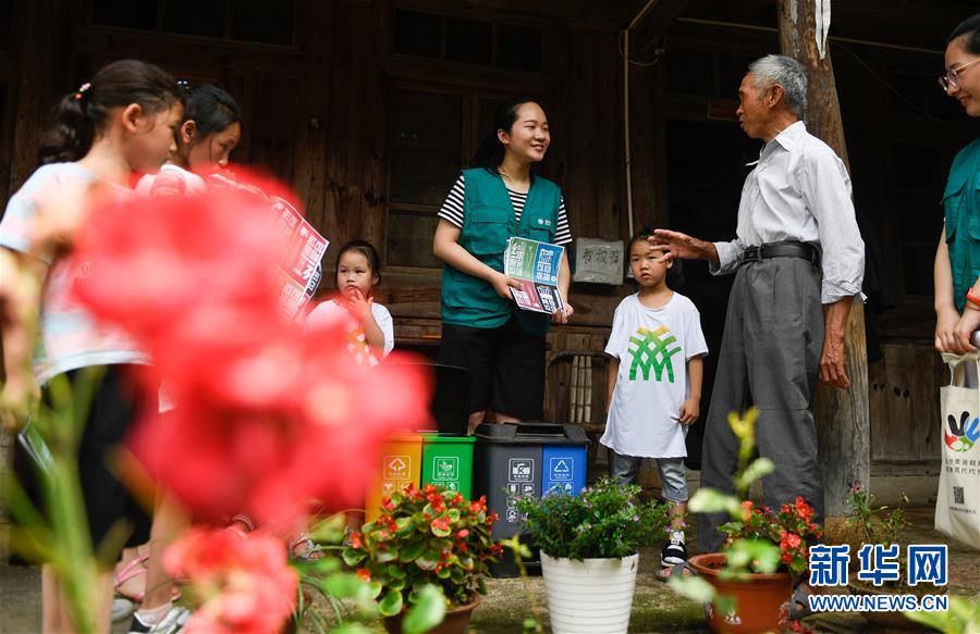 寧波市奉化區(qū)的小草志愿服務(wù)隊志愿者(中)在大堰鎮(zhèn)箭嶺村向村民和小學(xué)生講解垃圾分類的方法(2019年6月30日攝)。近年來,浙江省通過創(chuàng)新宣傳教育,多措并舉促進垃圾分類投放、收運及處置的良性循環(huán),引領(lǐng)垃圾分類成為城鄉(xiāng)居民的生活新風(fēng)尚。新華社記者黃宗治攝。