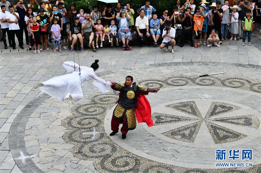 8月8日,游客在貴州省龍里縣“龍門(mén)鎮(zhèn)”武俠文化主題景區(qū)觀看武俠劇表演。近日,貴州省黔南布依族苗族自治州龍里縣境內(nèi)氣候宜人,龍里油畫(huà)大草原、“龍門(mén)鎮(zhèn)”武俠文化主題景區(qū)等景點(diǎn)吸引眾多游客前來(lái)觀光旅游。新華社記者楊文斌攝。