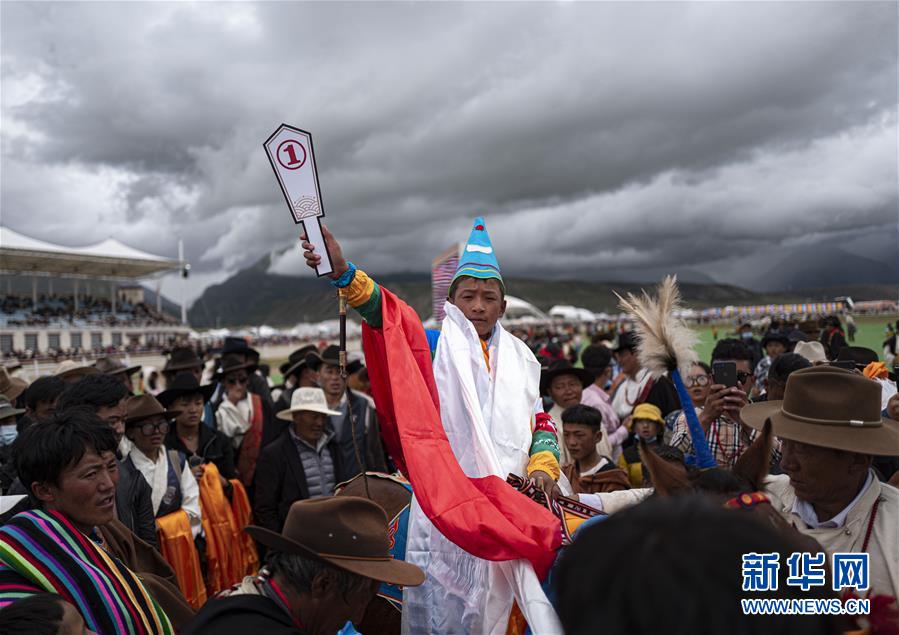 8月10日,羊八井鎮(zhèn)桑巴薩三組格桑占堆家的馬獲得“當吉仁”賽馬五公里馬長跑比賽第一名。新華社記者普布扎西攝。
