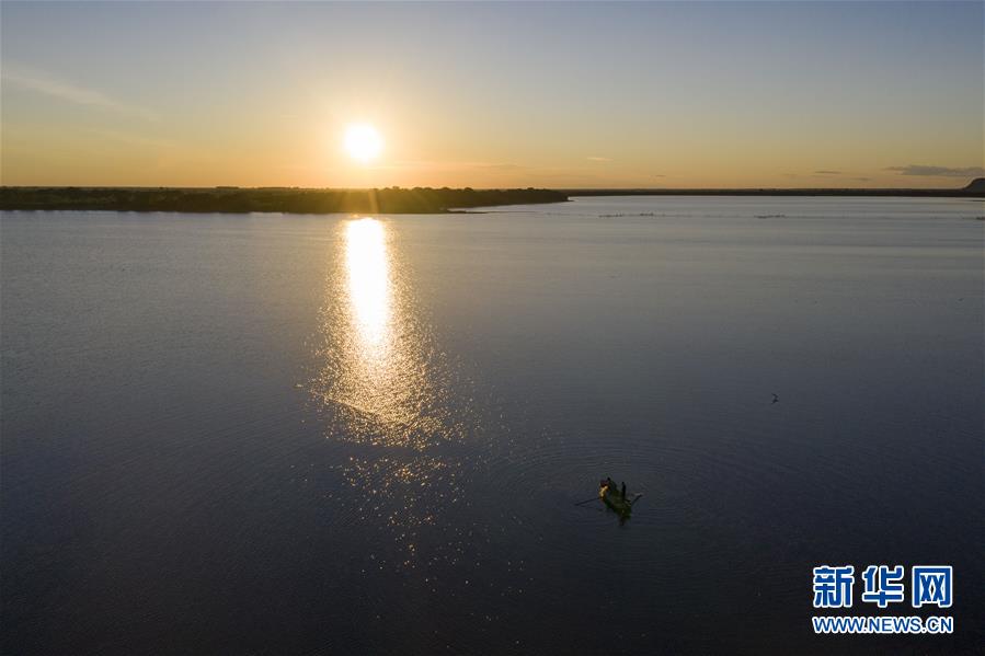 7月24日,漁民在大力加湖中捕魚(無人機(jī)照片)。大力加湖面積28.5平方公里,兩岸地勢低平,多濕地、草原,湖內(nèi)水產(chǎn)豐富。新華社記者謝劍飛攝。
