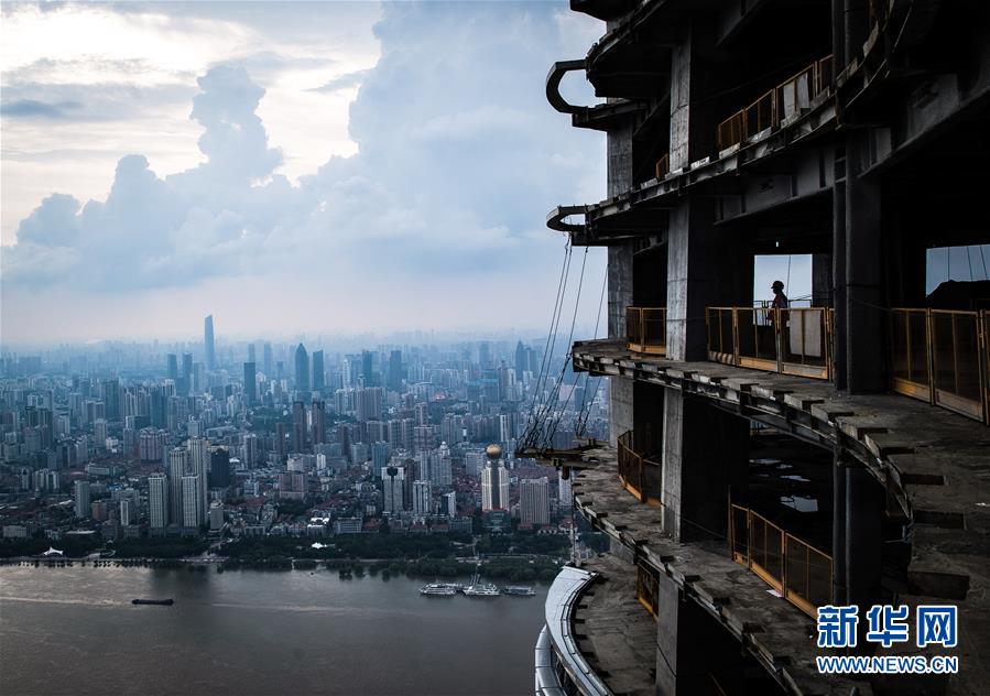 8月11日,一名工人在武漢綠地中心項(xiàng)目建設(shè)現(xiàn)場(chǎng)近500米的高空遠(yuǎn)眺。新華社記者肖藝九攝