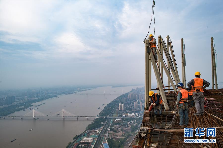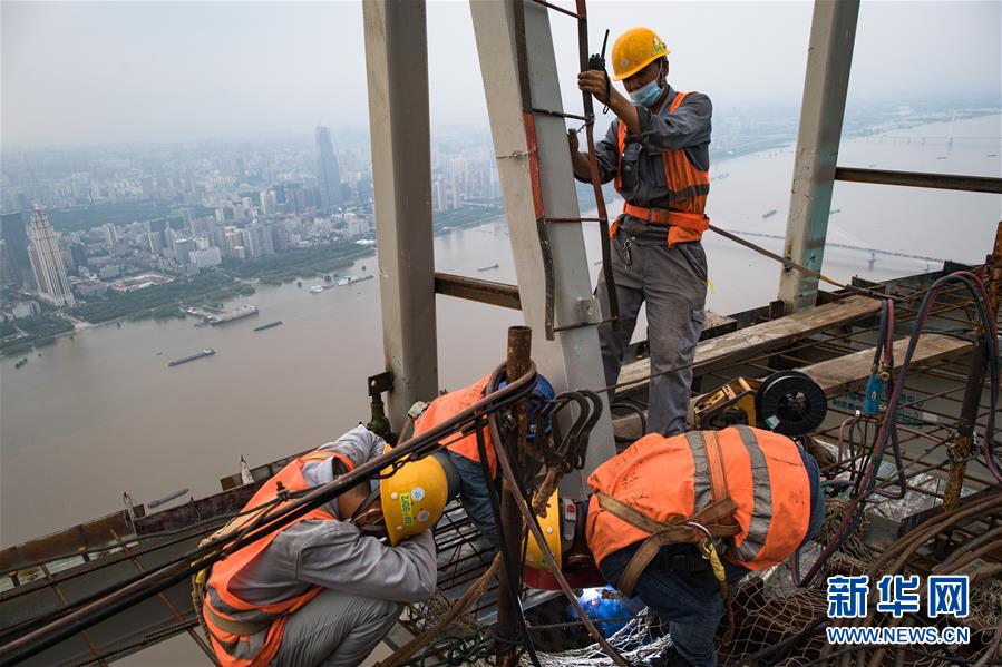 8月11日,工人在武漢綠地中心項(xiàng)目建設(shè)現(xiàn)場(chǎng)近500米的高空施工。新華社記者肖藝九攝