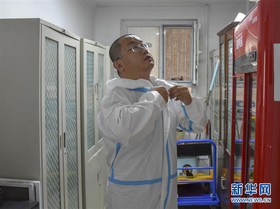 8月12日,烏魯木齊市天山區(qū)山西巷社區(qū)工作人員王志鷹在穿防護(hù)服。新華社記者 高晗 攝