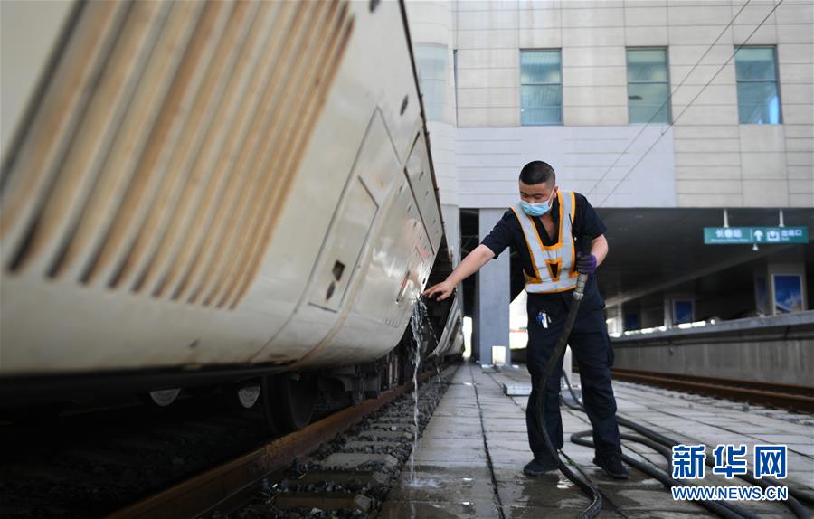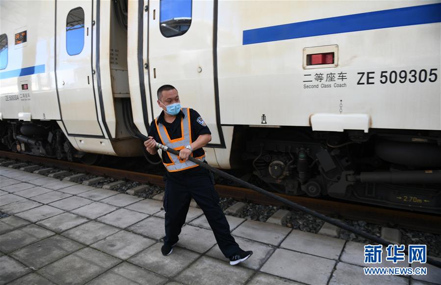 8月12日,長春火車站客運車間上水工龔關(guān)在給列車上水。新華社記者 林宏 攝