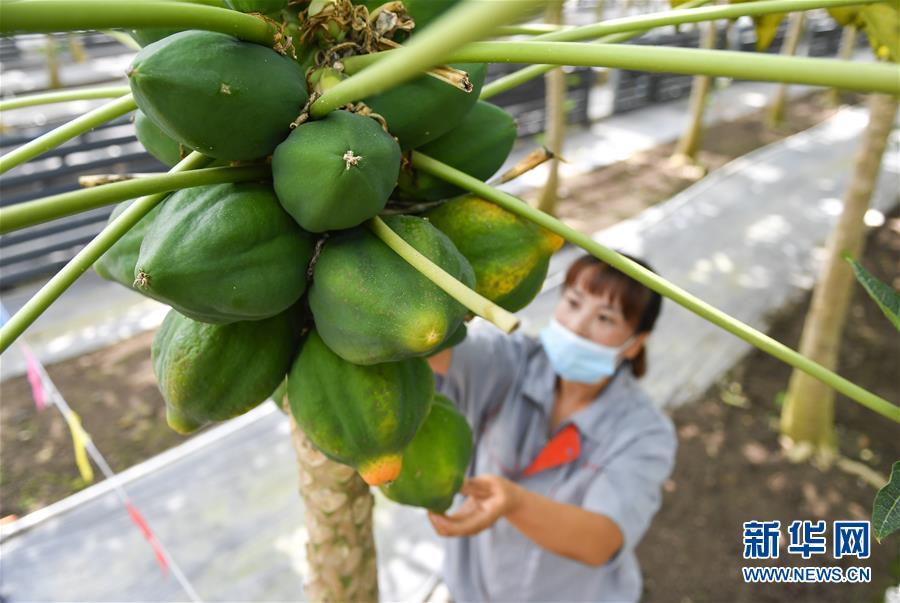 在吉林省永吉縣萬昌鎮(zhèn)宇豐紅果木瓜產(chǎn)業(yè)園,工作人員在大棚內(nèi)管護(hù)木瓜(8月12日攝)。新華社記者 許暢 攝