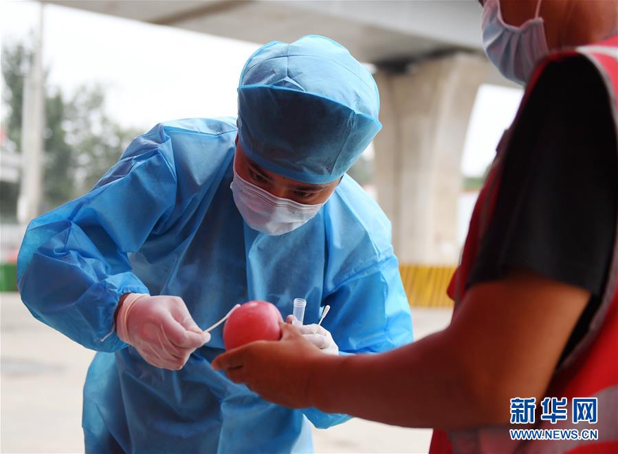 工作人員在新發(fā)地批發(fā)市場(chǎng)周轉(zhuǎn)新區(qū)對(duì)進(jìn)場(chǎng)蔬果進(jìn)行取樣(8月6日攝)。 新華社記者 張晨霖 攝