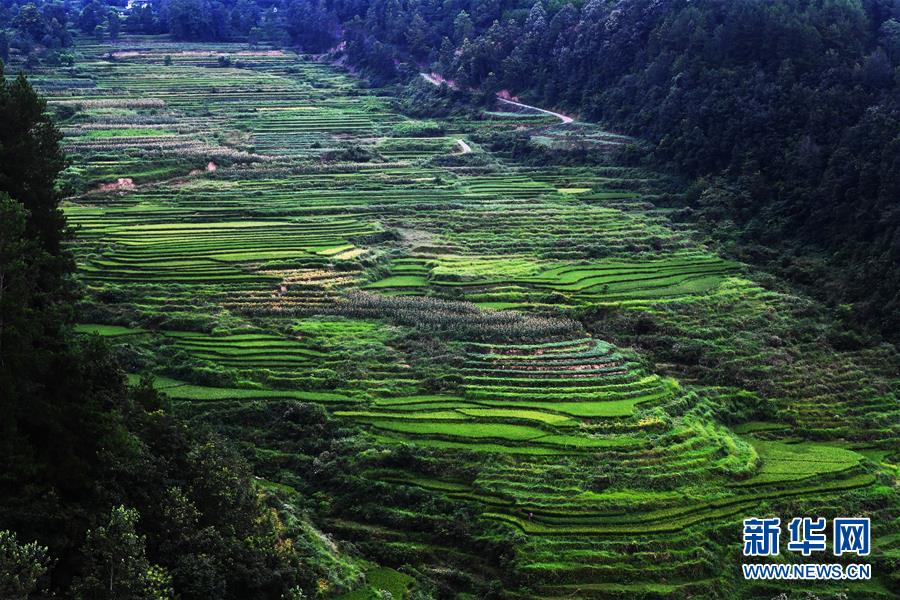 這是8月13日拍攝的鞍子鎮(zhèn)大林村梯田景色。時下,重慶市彭水苗族土家族自治縣鞍子鎮(zhèn)大林村的梯田景色迷人,構成一幅幅山鄉(xiāng)田園美景。新華社記者王全超攝
