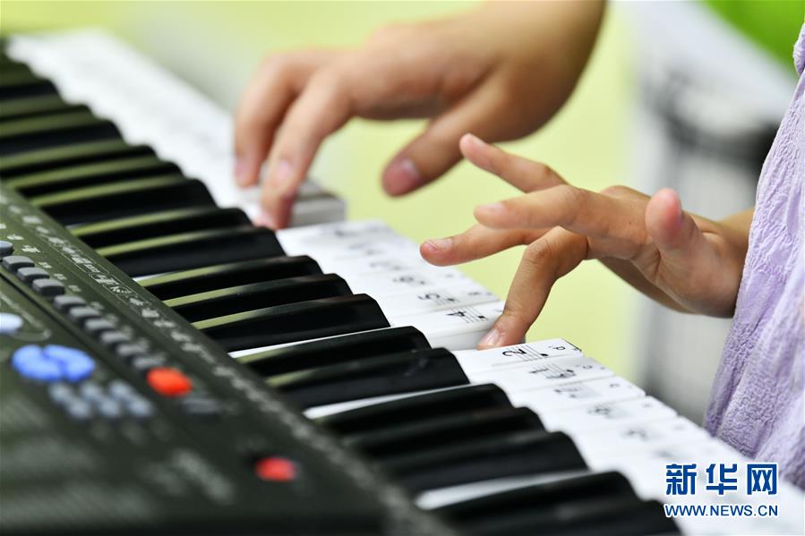 8月13日,在貴州省思南縣雙塘街道麗景社區(qū)易地扶貧搬遷安置點,志愿者在指導(dǎo)孩子學(xué)彈電子琴。新華社記者楊文斌攝