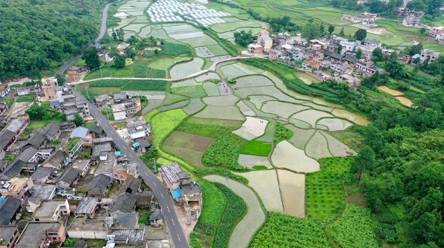 夏日時(shí)節(jié),貴州省貴定縣昌明鎮(zhèn)郊外稻田翠綠,房屋村寨星羅棋布,呈現(xiàn)出一幅美麗的田園畫卷。