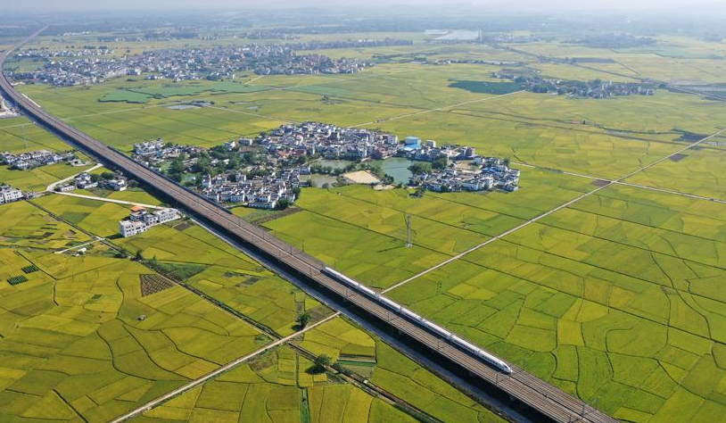 眼下,廣西賓陽縣古辣鎮(zhèn)大面積稻田進入收獲期,一列列南來北往的動車從稻田間飛馳而過,構成一幅幅美麗的豐收圖畫。