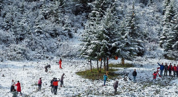 當(dāng)日,一場夜雪后,川藏線高爾寺山至理塘路段披上了一層銀裝。雪山、牦牛、云朵、松林,帶來了濃濃的雪域風(fēng)情。