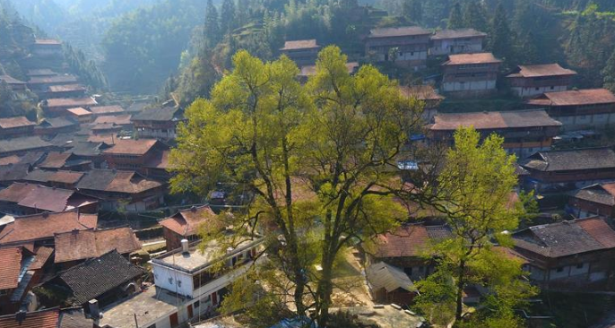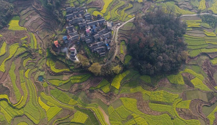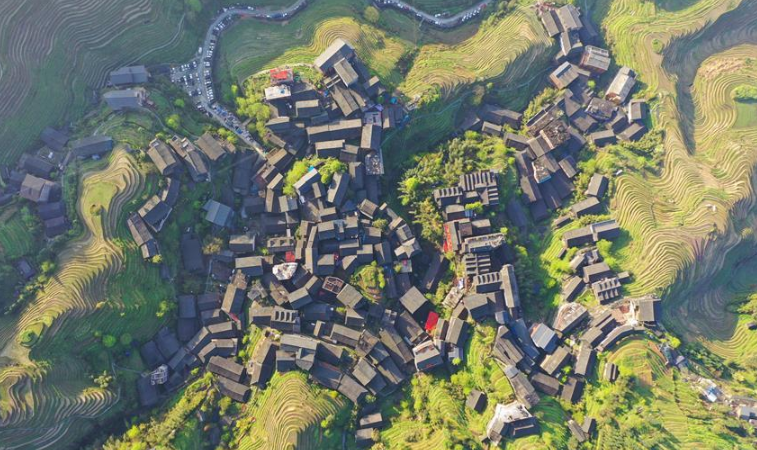 這是3月29日無人機(jī)拍攝的廣西融水苗族自治縣桿洞鄉(xiāng)黨鳩村的田園春色。