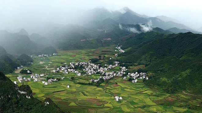 初秋時(shí)節(jié),廣西隆林各族自治縣克長(zhǎng)鄉(xiāng)田野鋪金,山青水綠,呈現(xiàn)出一幅清新的秋日畫卷。