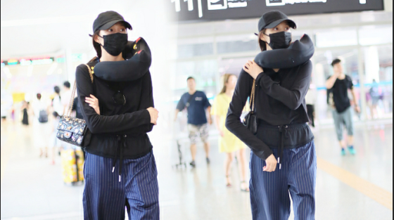關(guān)曉彤淡定抱臂行走,脖子上掛U型枕毫無(wú)偶像包袱。