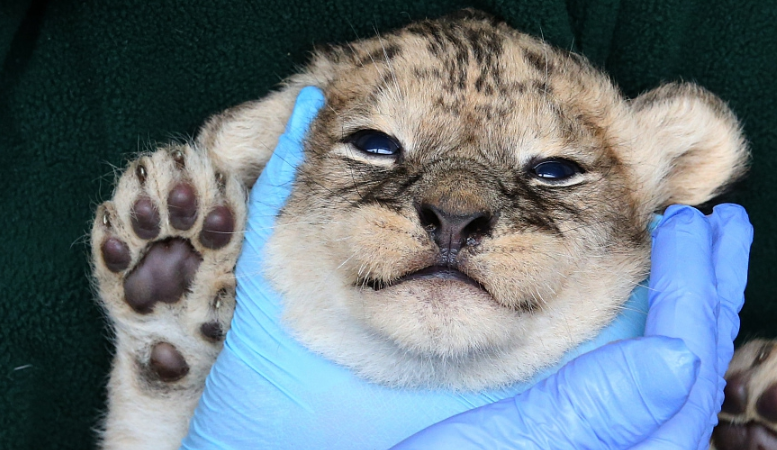 英國(guó)斯特靈,布萊爾德拉蒙德野生動(dòng)物園四只三周大的幼獅接受首次健康檢查。