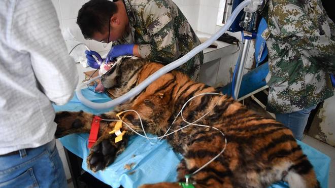 云南野生動物園為百獸之王洗牙齒