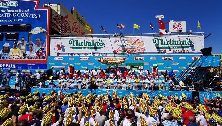 7月4日,在美國紐約康尼島,人們觀看吃熱狗大賽。在女子組比賽中,三木須藤10分鐘內(nèi)吃下31個(gè)熱狗,連續(xù)第六次贏得冠軍。