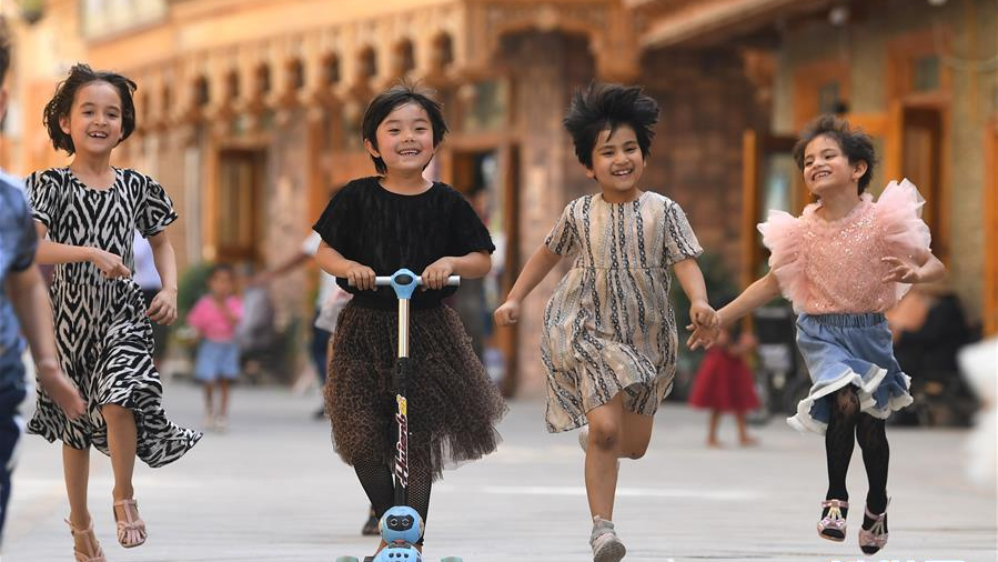 5月27日,孩子們?cè)谛陆吞锸小皥F(tuán)城”的鴿子巷玩耍。