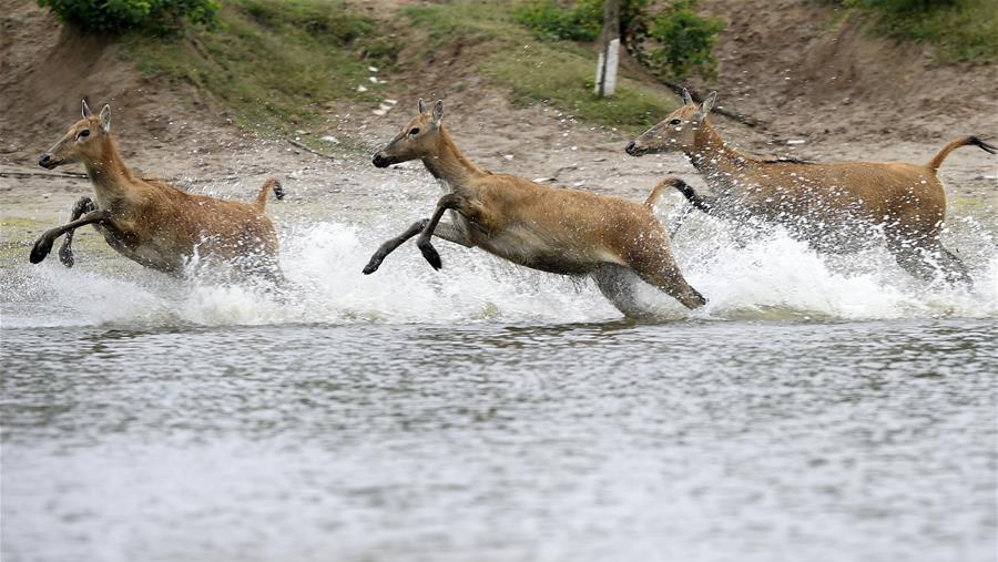 6月10日在江蘇大豐麋鹿國(guó)家級(jí)自然保護(hù)區(qū),麋鹿在水塘覓食。