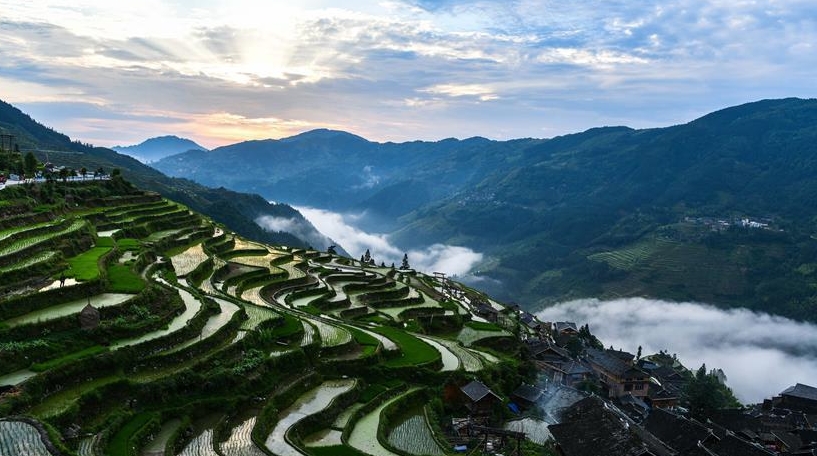 夏日時節(jié),位于貴州省黔東南苗族侗族自治州從江縣加榜鄉(xiāng)加車、加頁、黨扭等苗寨的梯田在晨霧與陽光的映襯下線條分明,光影變幻,景色如畫。