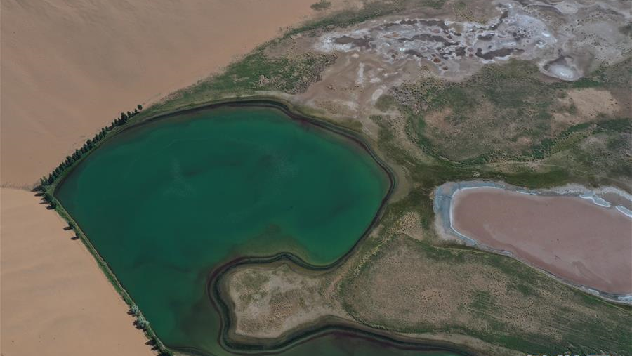 內(nèi)蒙古自治區(qū)巴丹吉林沙漠腹地分布著形狀各異的湖泊。湖泊點綴黃沙之中,成為別致的風景。