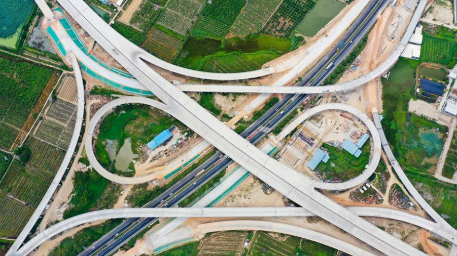 這是已經(jīng)建設(shè)完成的潮汕環(huán)線高速公路上北互通立交,沈海高速公路從該互通立交下面穿過(無人機(jī)照片,7月31日攝)。