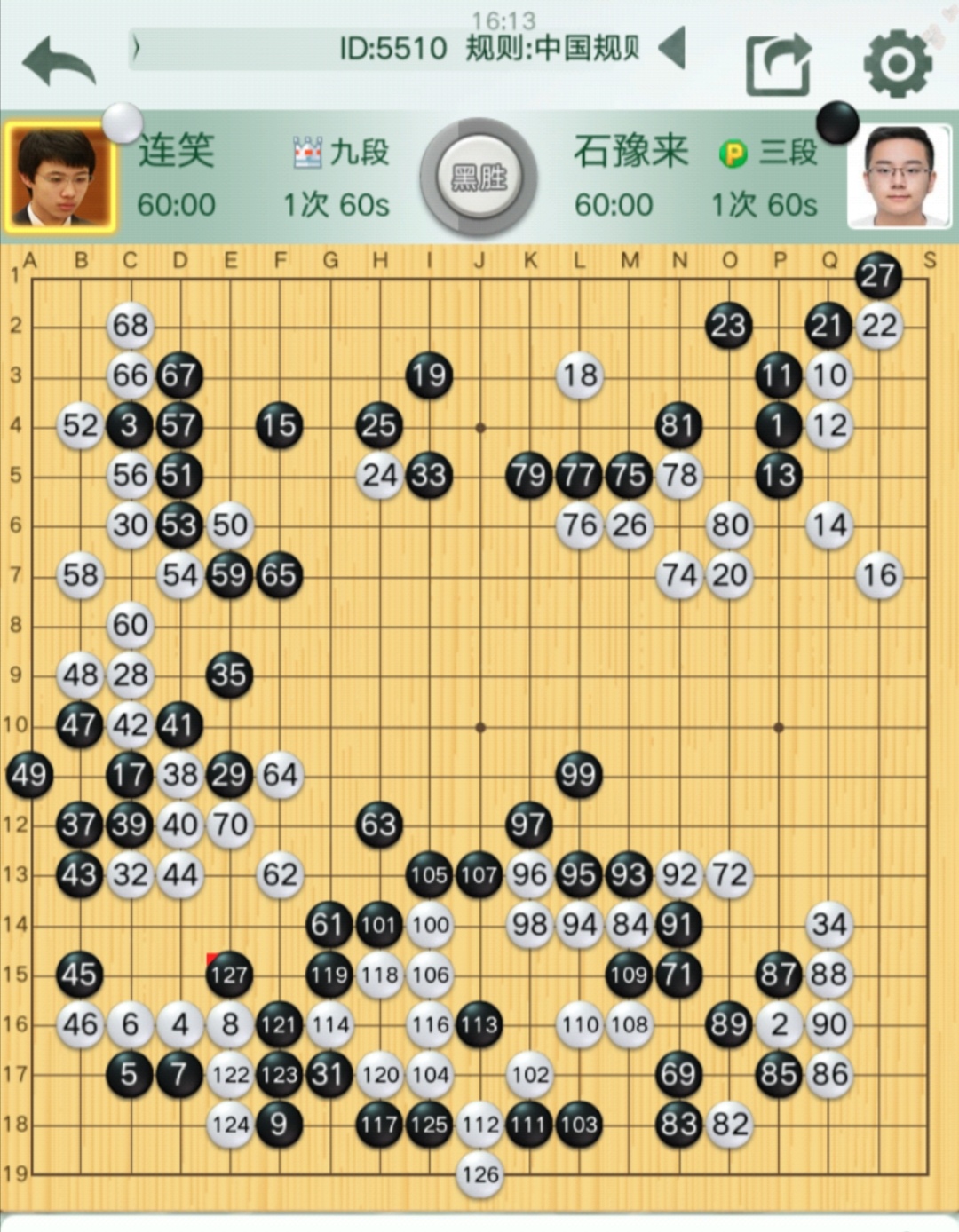 第四臺(tái)連笑九段VS石豫來(lái)三段(對(duì)局棋譜)。石豫來(lái)又發(fā)猛力,再下一城。連笑九段前三輪皆敗,本輪執(zhí)白對(duì)石豫來(lái)三段,先手壓縮上邊盤黑陣后優(yōu)勢(shì)在握,但隨即白棋打入下邊盤黑陣全部遭屠,連笑再敗一局,狀態(tài)低迷之極。