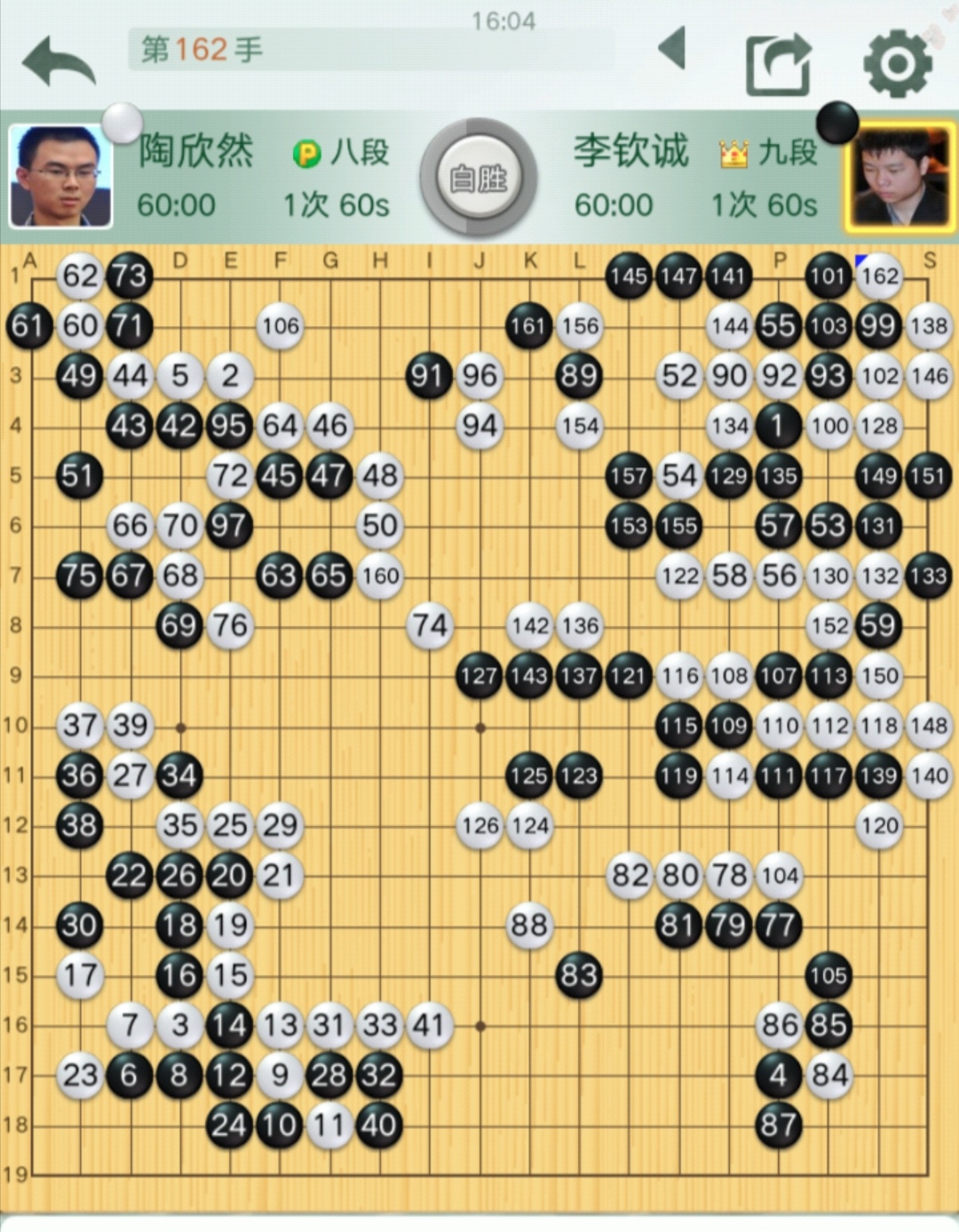 第三臺(tái)李欽誠(chéng)九段VS陶欣然八段(對(duì)局棋譜)。陶欣然率先鳴金,贏下一局。領(lǐng)隊(duì)梁偉棠九段對(duì)這盤棋很贊賞,認(rèn)為陶欣然這盤棋下得非常漂亮,氣勢(shì)磅礴,有宇宙流再現(xiàn)的感覺。開局在左下角形成白棋取外勢(shì),黑棋取實(shí)地的局面后,陶欣然將外勢(shì)發(fā)揮到淋漓盡致,在上面左右兩個(gè)角都繼續(xù)貫徹意圖,全力推進(jìn),形成了從上邊至中腹的巨大模樣,特別是在右下角一步五路尖沖,技驚四座,后來(lái)黑棋勉強(qiáng)進(jìn)來(lái)中腹破空,遭到陶欣然的全部殲滅。白棋僅162手,就取得了勝利!技驚四座那步棋是78手,猶如絕藝附身。