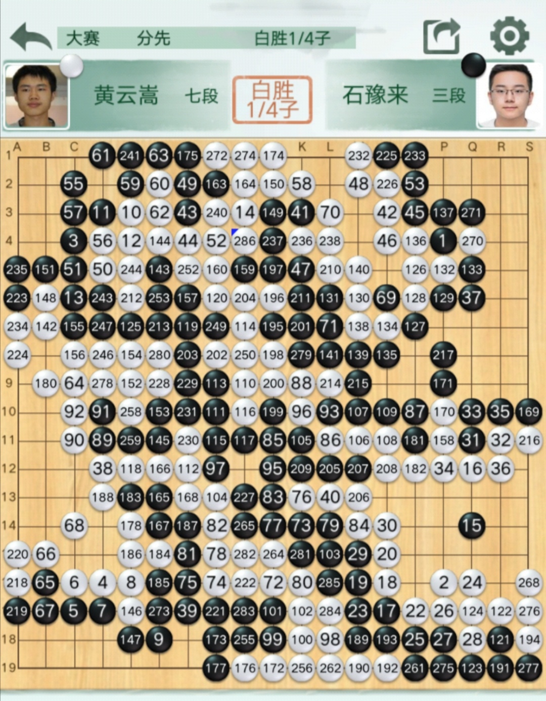 緊接著,連勝柁嘉熹、連笑兩位頂尖九段的石豫來三段執(zhí)黑對黃云嵩七段,雙方大戰(zhàn)286手,局面細膩,勝負天平一直在左右擺晃,收官時石豫來出現(xiàn)了致命的失誤,最終小石以四分之一子惜敗于黃云嵩。