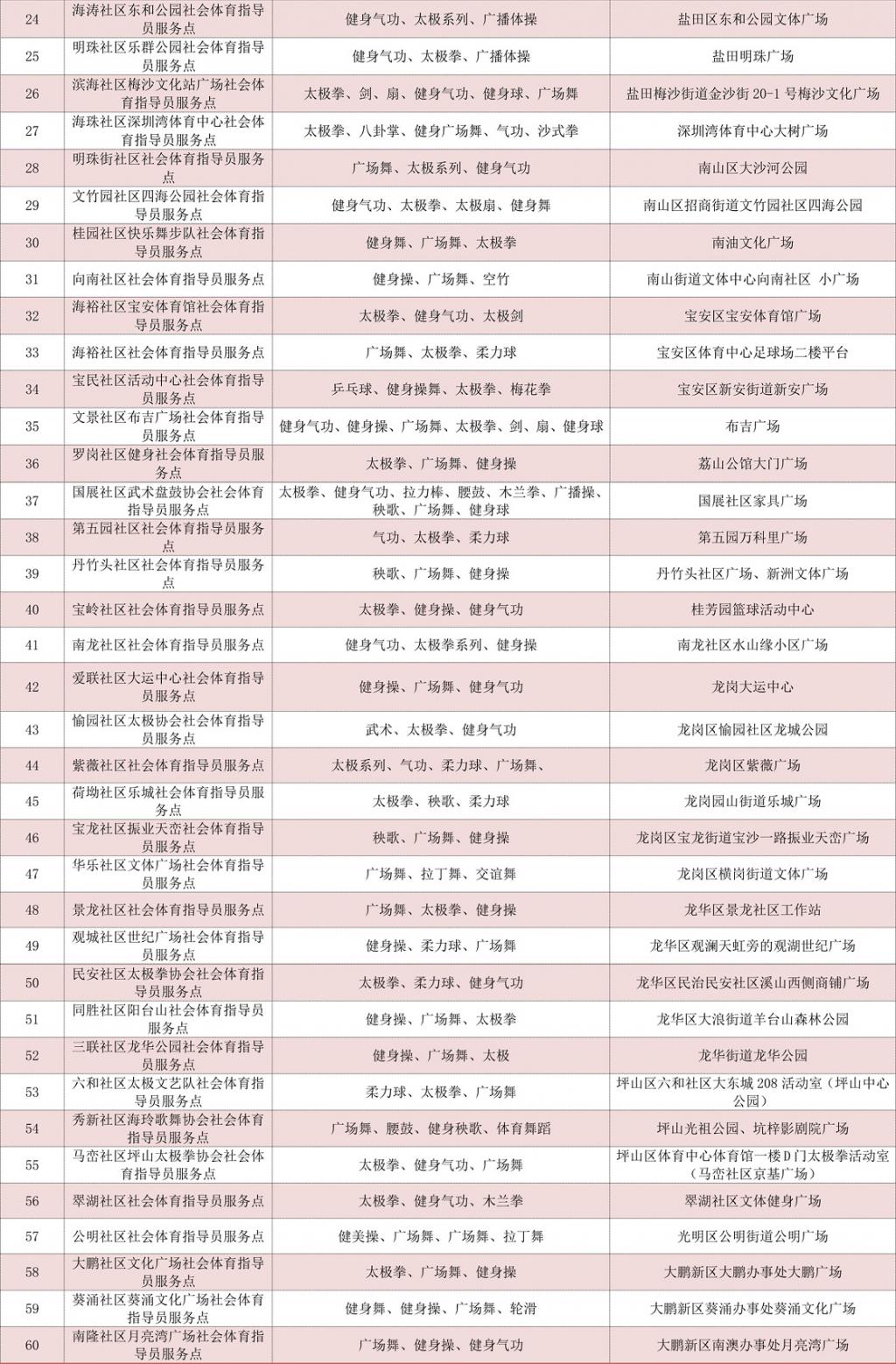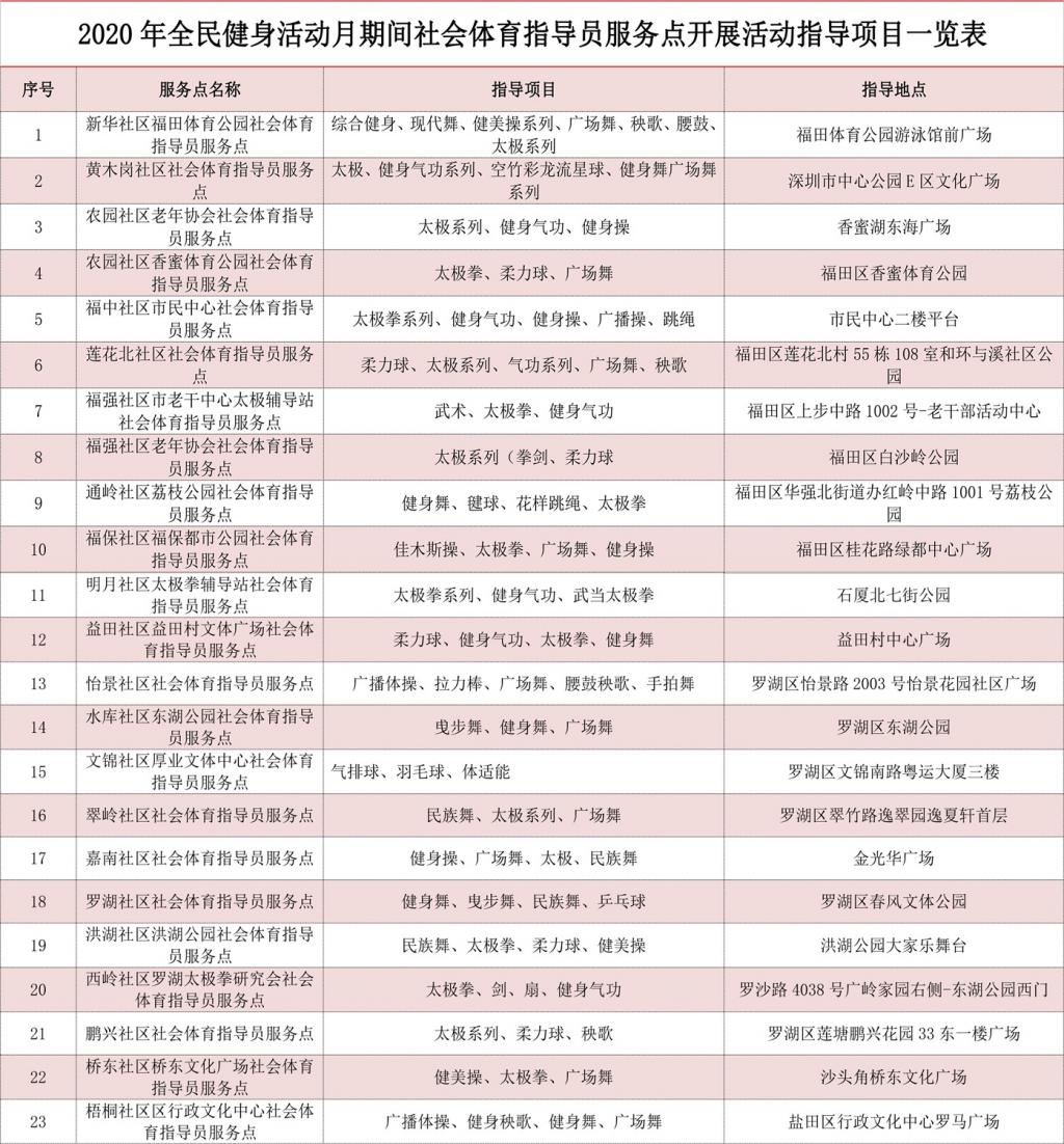 2020深圳全民健身活動(dòng)月社會(huì)體育指導(dǎo)員服務(wù)點(diǎn)表: