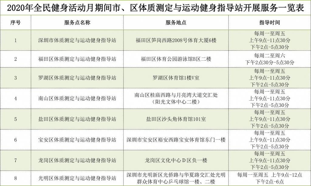 2020年深圳全民健身活動(dòng)月期間體質(zhì)測(cè)定服務(wù)表:
