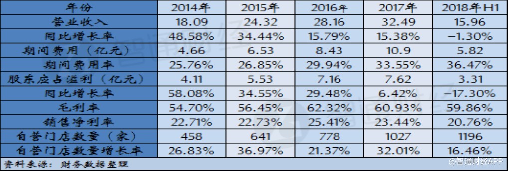 根據(jù)智通財經(jīng)APP的梳理,周黑鴨自營門店數(shù)量在2014年為458家,此后三年公司自營門店數(shù)量每年都有超過20%的增長,但期間公司營業(yè)收入增幅卻呈現(xiàn)放緩的趨勢。與此同時,公司門店數(shù)量的增長也帶來費用率逐年提升,截至2017年,公司期間費用率達(dá)到33.55%,以至于公司凈利潤增速同比下滑超過23個百分點。公司2018年中期財報顯示,上半年公司門店數(shù)量凈增長169家,較2017年增長16.46%,門店數(shù)量快速增長的勢頭雖然的已延續(xù),但卻支撐不起公司營收繼續(xù)保持增長,同時公司期間費用率進一步提升至36.47%,導(dǎo)致盈利水平大幅下滑。