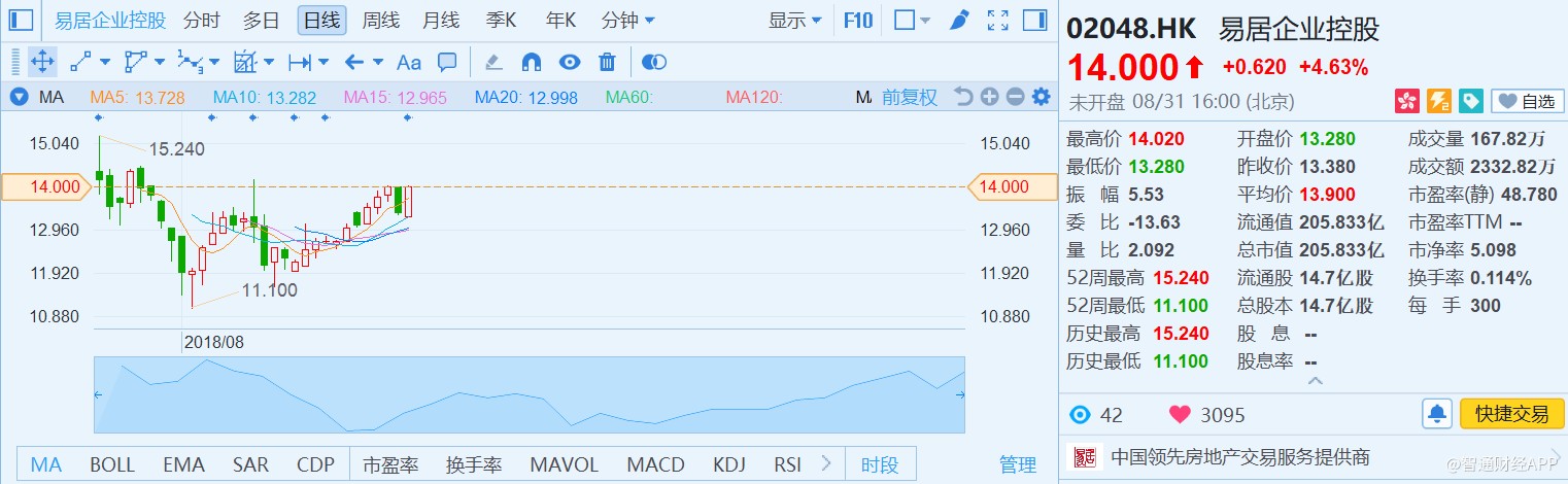 中國房地產(chǎn)行業(yè)正站在拐點上,行業(yè)集中度將進一步提升,存量市場成為各路資本的新戰(zhàn)場,“服務(wù)生”易居在資源及戰(zhàn)略布局上已做好充分準備,上半年的成績或許只是新的起點。8月31日,易居股價收漲4.63%,報14港元。