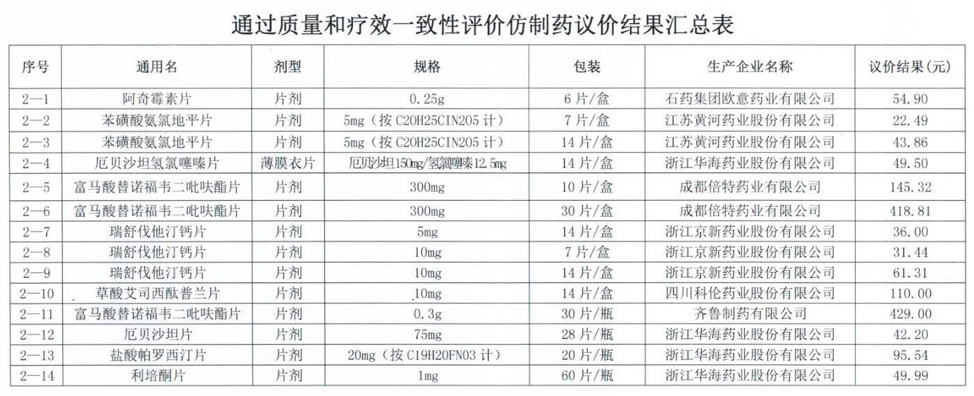 在議價的品種中,通過一致性評價全部議價成功的14個藥品包括石藥(01093)歐意的阿奇霉素片、江蘇黃河的苯磺酸氨氯地平片、浙江華海的厄貝沙坦片、京新藥業(yè)的瑞舒伐他汀鈣片、科倫藥業(yè)的草酸艾司西酞普蘭片、成都倍特和齊魯制藥的富馬酸替諾福韋二吡呋酯片等。