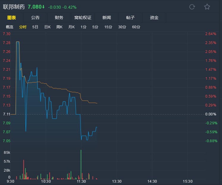 臨近上午收盤,聯(lián)邦制藥報(bào)7.08港元,跌0.42%。(文文)