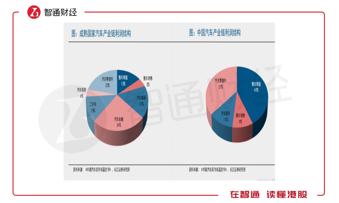 實際上,整個產(chǎn)業(yè)鏈各部分成長及盈利水平不一樣,未來利潤結(jié)構(gòu)變化也會不一樣。不過根據(jù)發(fā)達國家的成長路徑,整車及零部件肯定是要讓利給下游的,特別是輔助銷售環(huán)節(jié)的汽車租賃及汽車金融板塊。