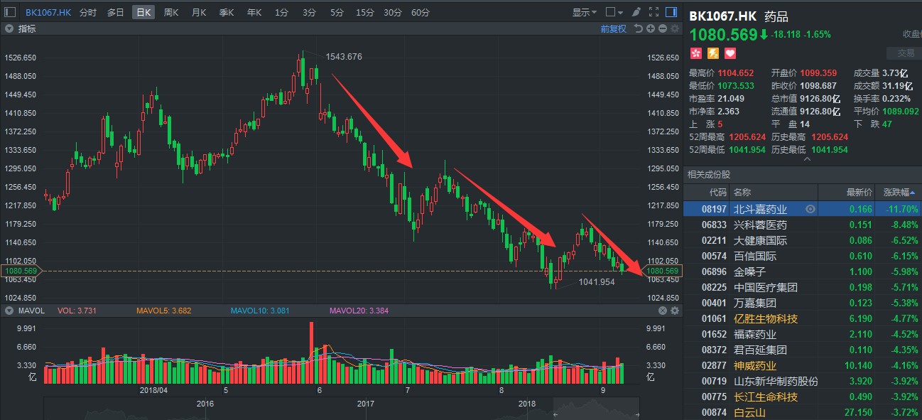 據(jù)智通財經(jīng)APP觀察,截至9月10日,上證跌了1.21個點(diǎn);恒指跌幅超過1.33%,50只成分股,僅包括九龍倉置業(yè)(01997)在內(nèi)的6只股票小范圍飄紅,而醫(yī)藥板塊方面,繼續(xù)下挫,普遍以“掛綠”收盤,大勢可謂慘不忍睹。