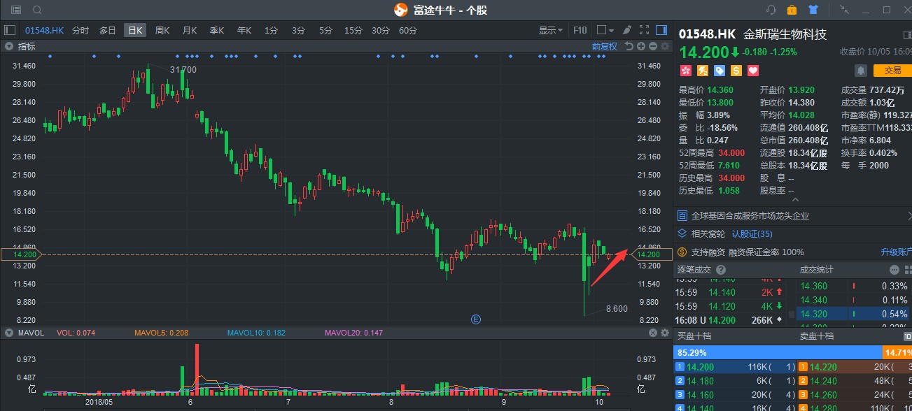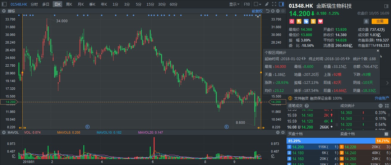 談及去年的港股牛市,金斯瑞應(yīng)該算得上是生物醫(yī)藥板塊中,非常引人注目的一只股票。就算2018年隨大市回調(diào),但表現(xiàn)仍可圈可點(diǎn):受益港股通北水資金利好,成交量異常活躍,成交量平均每日達(dá)到2000萬(wàn)股,總額平均4.08億港元。細(xì)數(shù)港股通標(biāo)的,有如此活躍成交量的股票確實(shí)不多。